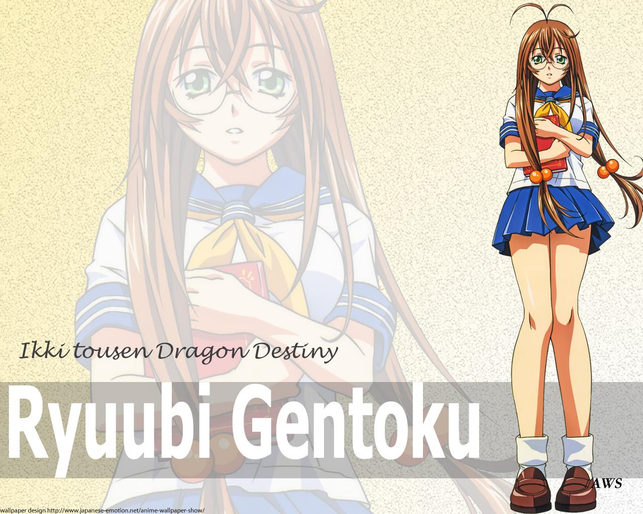 Where other Ikkitousen characters gain their fans through their badass reputations or dominating them into submission with their cool fighting skills, Ryuubi wins hers over though her charm and compassion. I think that she comes off as a lot more human and easier to relate to than some of the other Ikkitousen girls (who at times could be too cool for words). Ryuubi may not be the strongest fighter (at least not without her dragon anyway) but she's always trying to improve herself and do her best for the sake of her friends. Being clumsy, and maybe even a little bit ditsy, Ryuubi is the type of bookish girl that would much rather prefer reading to fighting but sadly gets the short end of the stick. As the leader of her school she's expected to do a lot of fighting eventhough she's not all that skilled and as a result is often the target of powerful fighters. To make matters worse even her dragon seems to be against her at one point trying to get her to disembowel herself. ^_^; Still, despite her naturally timid nature, this girl has a heart of gold and will really do anything to protect her friends if they are in danger. She doesn't think twice about entering a dangerous forest (where fighters are expected to die) to find her friend Kanu or diving into water when she sees a companion drowning despite the fact that she's a poor swimmer. Maybe that's why her teammates are so eager to respond in kind risking their lives to protect her as well.